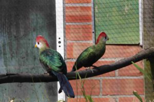 Als eerste langs een acht, of misschien wel tiental volières met verschillende Toerako soorten. De Witwang, Livingstone, Hartlaubs, Purperkuif, Witkuif, Grijze Bananeneter, Persa persa (groene) en Violet Schildtoerako heb ik gezien. Voor mij blijven het de mooiste vogels die er zijn, maar dat blijft aan smaak onderhevig.